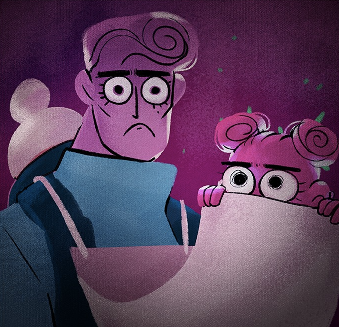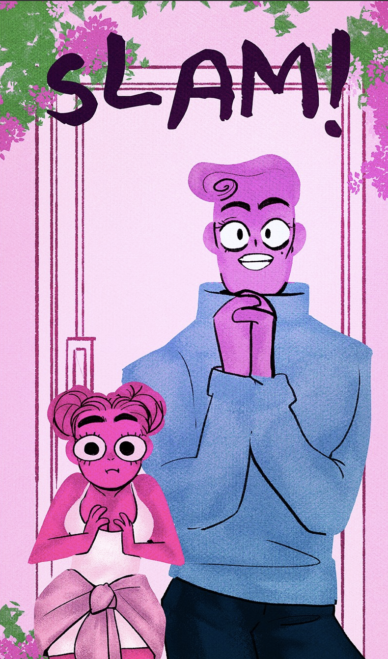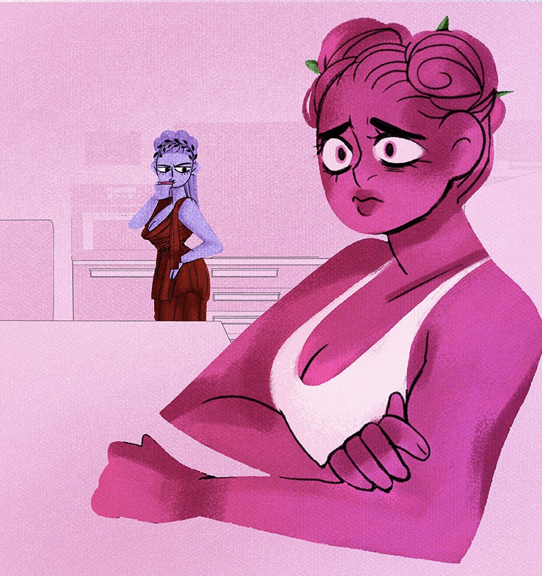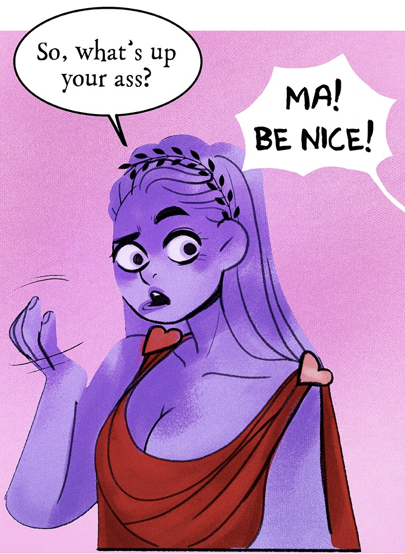 Aphrodite calls Persephone “mopey” and slams a hand on the table. Assessing her, Aphrodite guesses she has a crush on someone who is dating another, then guesses it’s Hades because she doesn’t know many men. Persephone is slowly sinking down in her seat. Eros and Aphrodite both darken in color slightly when they are scheming/guessing at something.